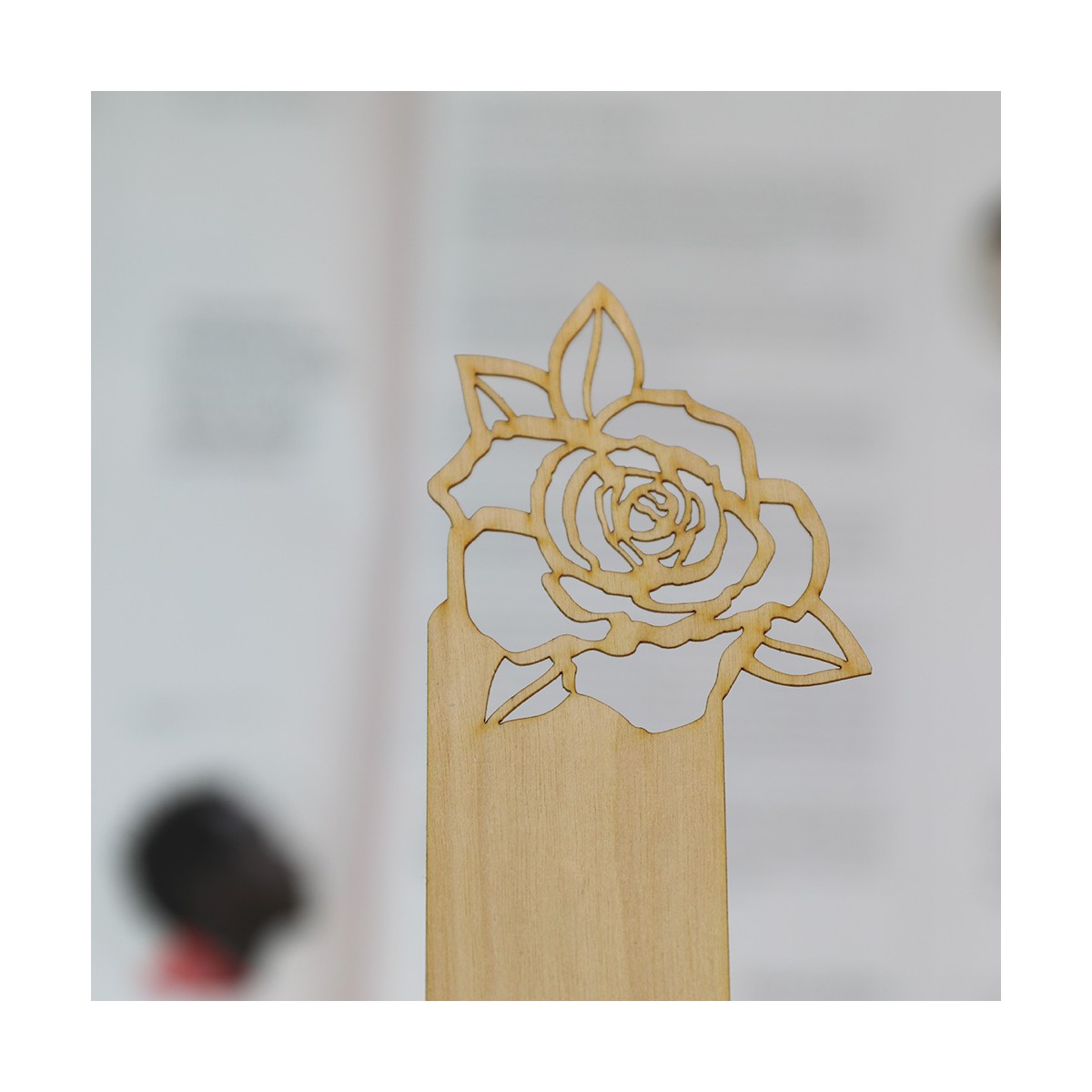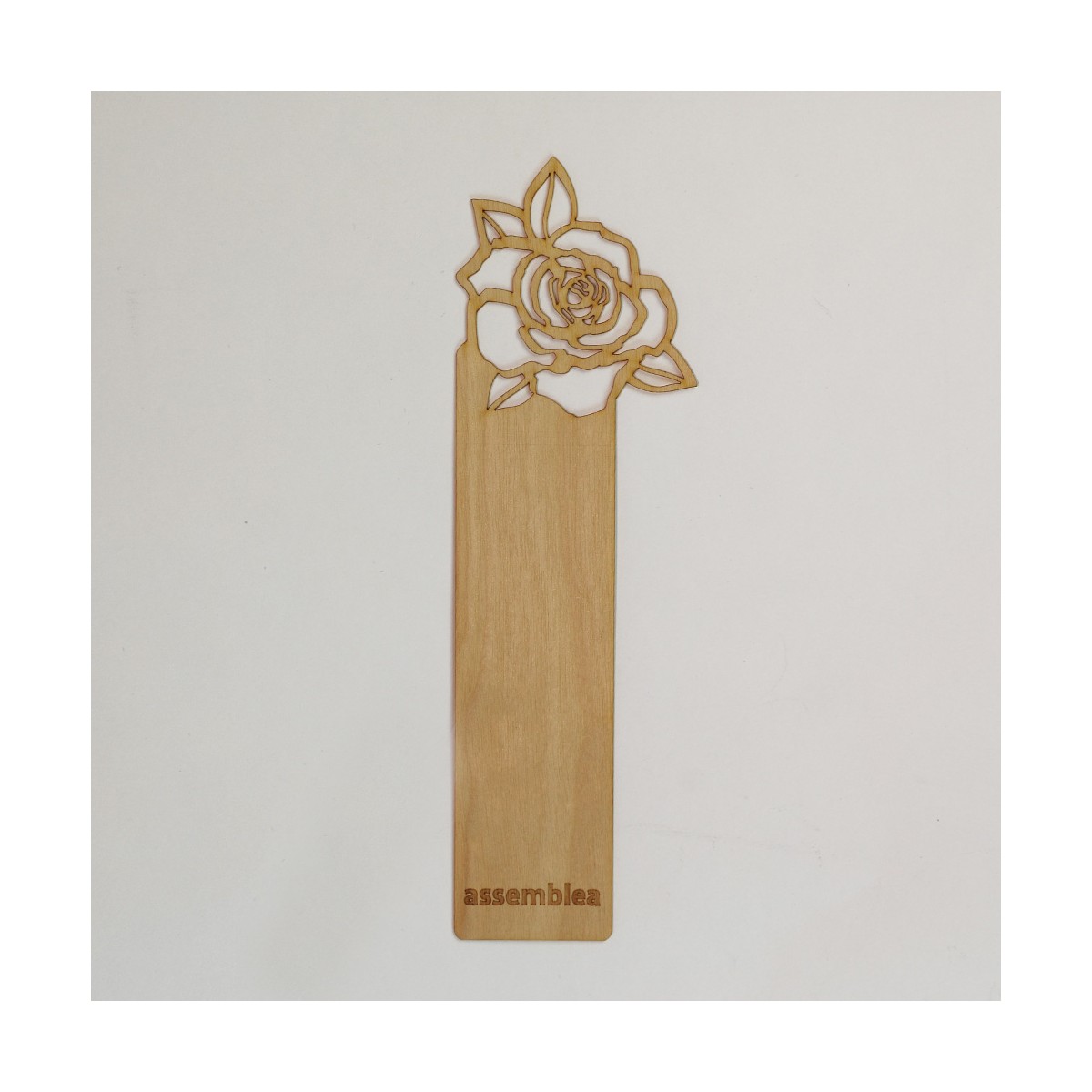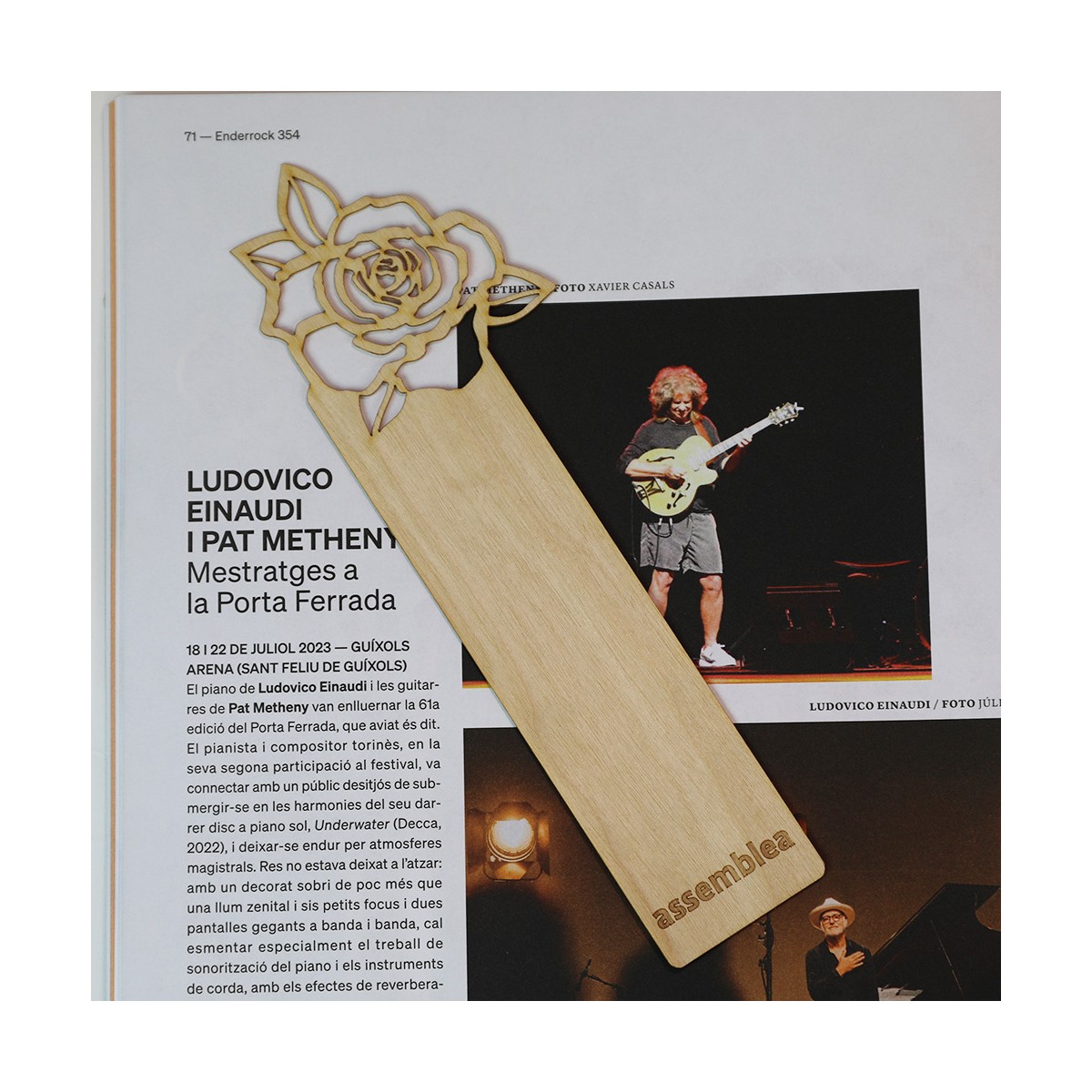 Aquest punt de llibre, fet en fusta de faig, és un refinat exemple de combinació per Sant Jordi, marcador de llibres i rosa, i inclou el logo de l'Assemblea. Un detall preciós per acompanyar el regal del llibre.